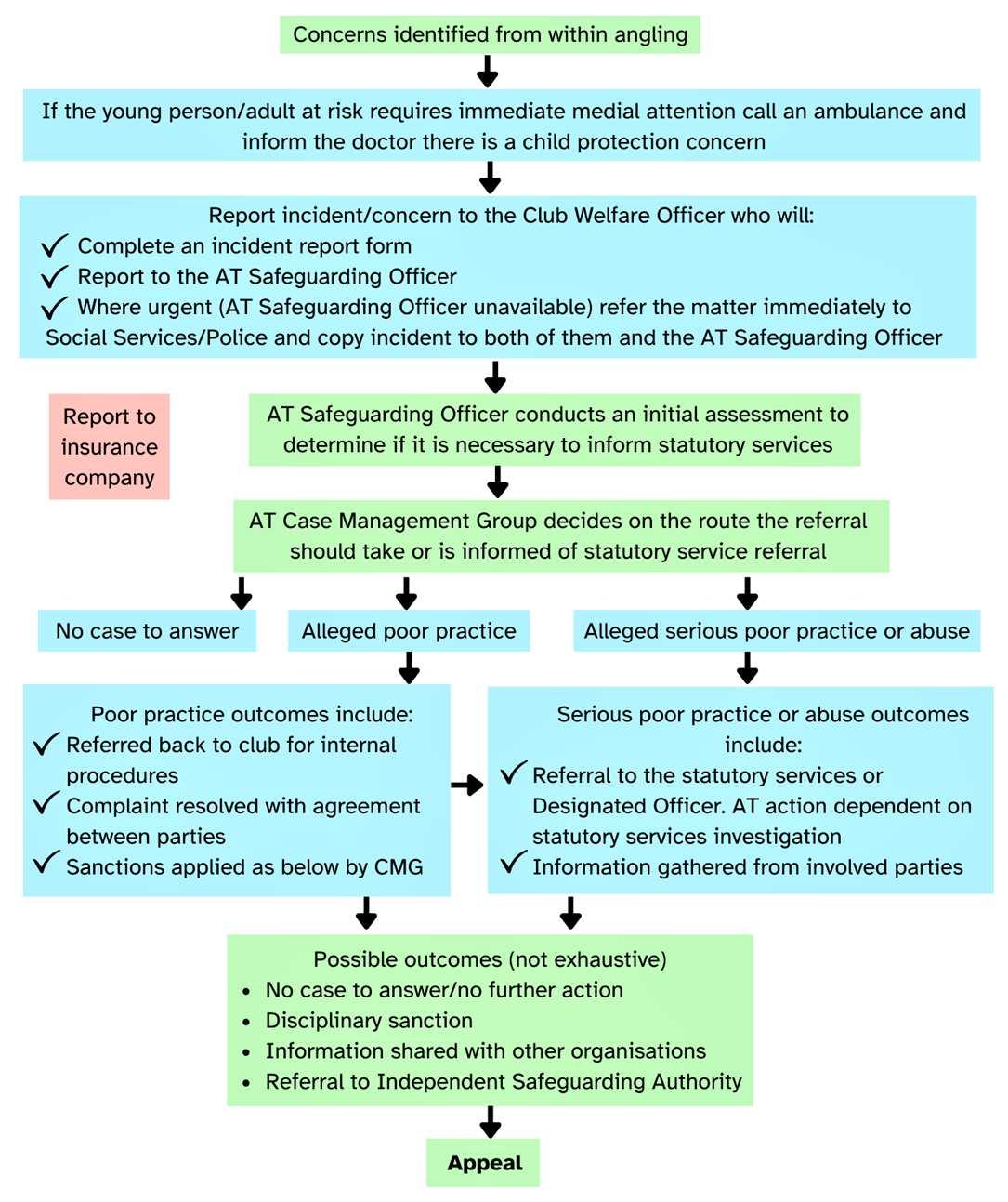 - Contact the Welfare Officer (details below) at the first opportunity who will record the details in writing on an Angling Trust incident reporting form and share it with the Angling Trust’s Lead Safeguarding Officer.